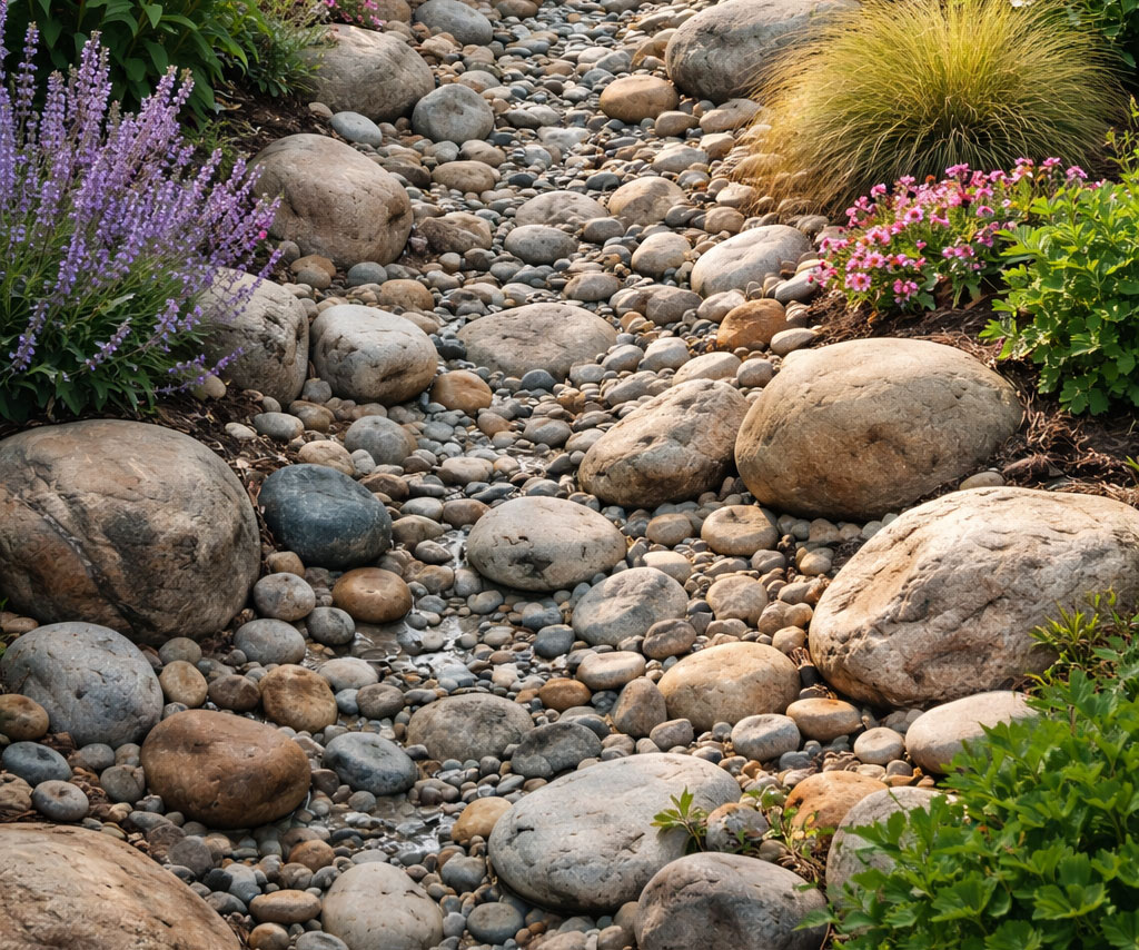 River rock is a versatile and naturally smooth stone that adds texture, contrast, and a polished look to any landscape.